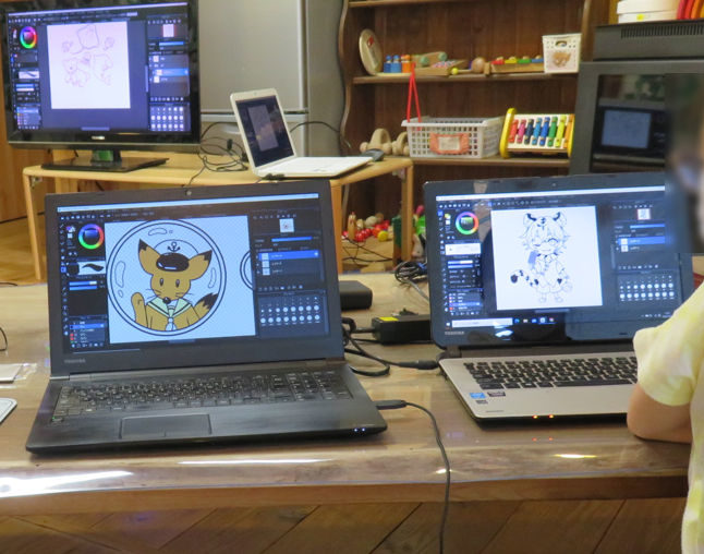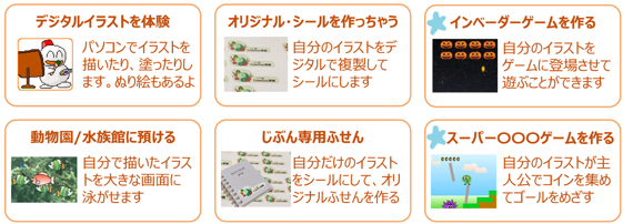 子どもたちは、好きなイラストを選んでデジタルで色塗りペイント。完成したイラストはオリジナルシールに印刷したり、デジタル水族館に放流したりして楽しみました。
