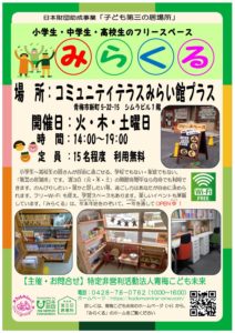「みらくる」はみんなの居場所です。 お子様をお預かりする場ではありませんのでご理解ください。 子ども自身が自分で考えて選んですごすことを大事にしています。 スタッフは、少しお手伝いをしますが、管理や注意、指示はしません。 […]