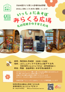 コミュニティcafe ちょこっと と同時開催! みらくる広場は、毎月第4木曜日10時から13時まで開催します。 本日、再始動しました。2組の親子がおもちゃの広場で遊んでくれました。ちょこっとcafeのシニアの皆さんともか […]