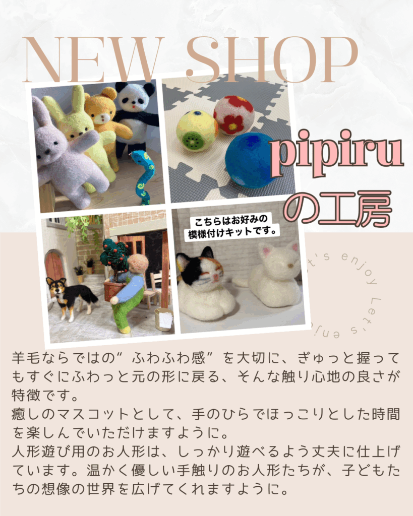 フェルトのぬいぐるみやボール。羊毛からさした手作りですが、手触りはふわふわです。