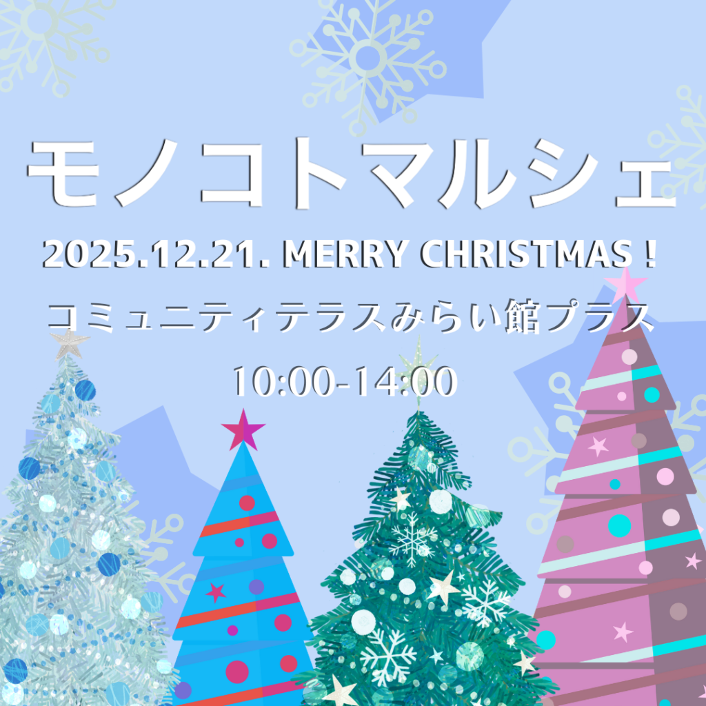 モノコトマルシェ・12月の開催案内 投稿日: 2025年12月16日 (2025年12月16日) 投稿者: rilakkumama モノコトマルシェ・vol.20! 今週末はモノコトマルシェ開催日です。 クリスマスムードを楽しむワークショップがいっぱい。 ヒノキのスワッグ作り、クリスマスオーナメントや刺繍リボンのキーホルダー、クリスマスデコが可愛いボールペン、などなど。 布小物のショップは、丁寧に作られたハンドメイドバッグが多数。 プレゼントにぴったりです。 動作療法によるリラクゼーションや、ライブペイントもあります。 毎回ユニークなフリマの出店も見逃せません。 今週末は暖かくなる予報ですね。 ぜひ遊びにお越しください。 詳細は、イベントページをご覧ください。 イベントページを見る モノコトマルシェとは?