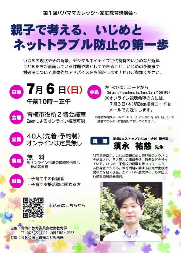 *オンライン視聴希望の方には9月19日(木)頃Zoom招待コードをメールでお送りします。社会教育課からのメール(div7510@city.ome.lg.jp)を受信できるように設定しておいてください。