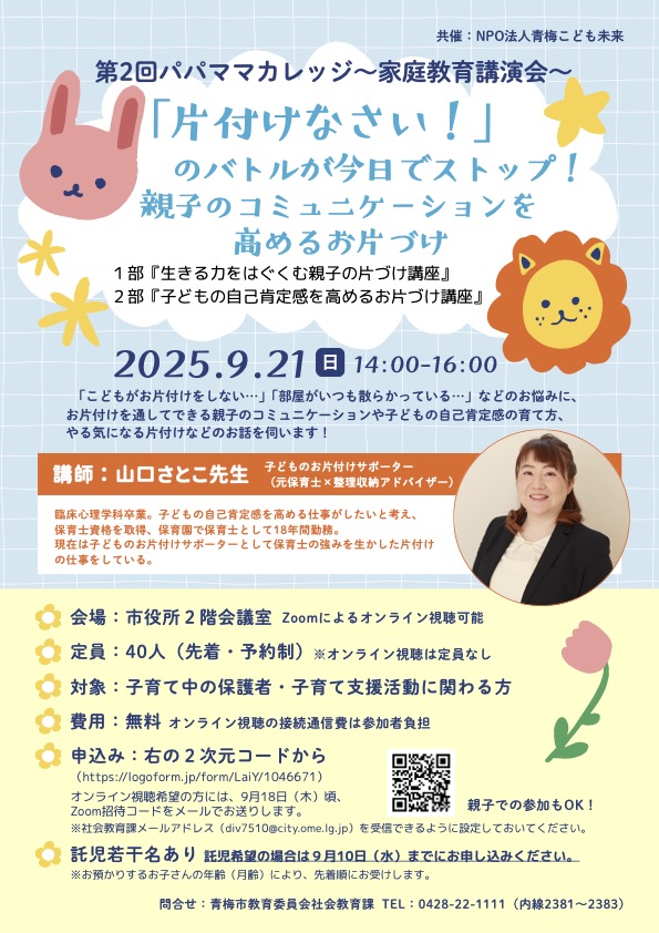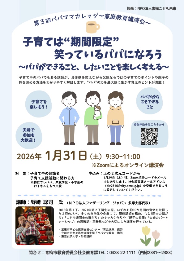 毎年、青梅市の社会教育課との協働で、子育てやくらしに役立つ講演会を年に3回開催しています。